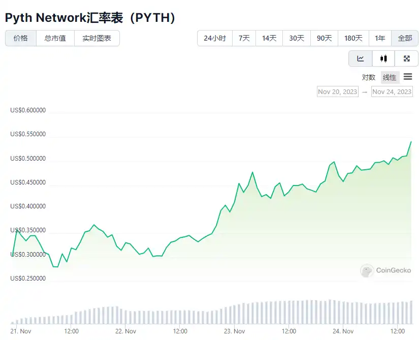 作为主攻 Solana 生态的预言机项目,伴随追溯性空投和「FTX 后裔」Backpack 的激励性空投引发社区持续关注。上线后,币价相较其他空投性币种更为强势,开盘不到 24 小时就直接拉升,截止发稿,PYTH 据其开盘最低价 0.28 美元已拉升近一倍。