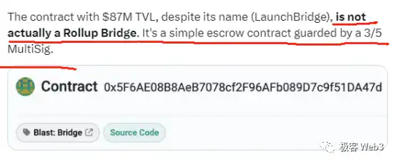 但 Blast 在获得阶段性成功的同时,也引来了许多专家的质疑。比如,L2BEAT 和 Polygon 工程师均一语道破:目前的 Blast 只是在以太坊上部署了接收充值的 Deposit 合约而已,这个合约可以在 3/5 多签的控制下升级,换句话说,合约的代码逻辑可能被改写,想 Rug 还是可以 Rug。同时,Blast 只是自称要实现 Rollup 结构,但现在的它只是一个空壳子,连提款功能都要等到明年 2 月上线。