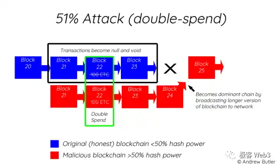 我们可以试想如下场景:一个只有几百人听闻过的 POW 公链,暂时处于高度去中心化状态,因为还没有出现一家独大的局面。但假如某个矿机企业突然把自己的算力全部投入该 POW 链,自己一人就比其他所有矿工的算力都高出很多倍,此时,这条 POW 链的去中心化将瞬间被瓦解。如果该矿机企业打算作恶,人们就只能通过社会共识来纠错。