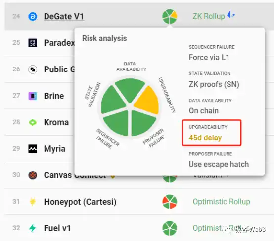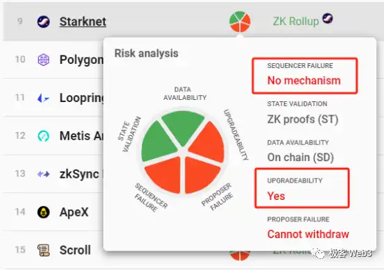 按照 L2BEAT 的数据,目前 Arbitrum、Optimism、Loopring、ZKSync Lite、ZkSync Era、Starknet、Polygon ZKEVM 等主流 Rollup 都采用了多签授权的可升级合约,可以绕开时间锁限制立刻 upgrade。(可以阅读极客 web3 往期文章:信用的游戏:被多签和委员会操控的 Rollup 们)