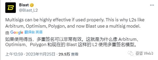 而 Blast 也不堪示弱的点破,绝大多数 Rollup 背后都靠一组多签管理合约升级权限,其他家 Layer2 指责「Blast 用多签」只是五十步笑百步而已。