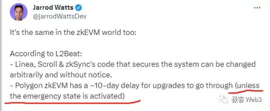 让人感到诧异的是,Optimism 过去只是用一个 EOA 地址管理合约升级,连多签都是今年 10 月才加上去的。至于曾对 Blast 展开抨击的 Polygon zkEVM,也可以在 6/8 多签授权下,对 Rollup 合约进行「紧急接管」,把 Layer2 从合约治理转为「赤裸裸的人治」。有趣的是,上文中对 Blast 进行批判的 Polygon 工程师也提到了这一点,但表现的含糊其辞。