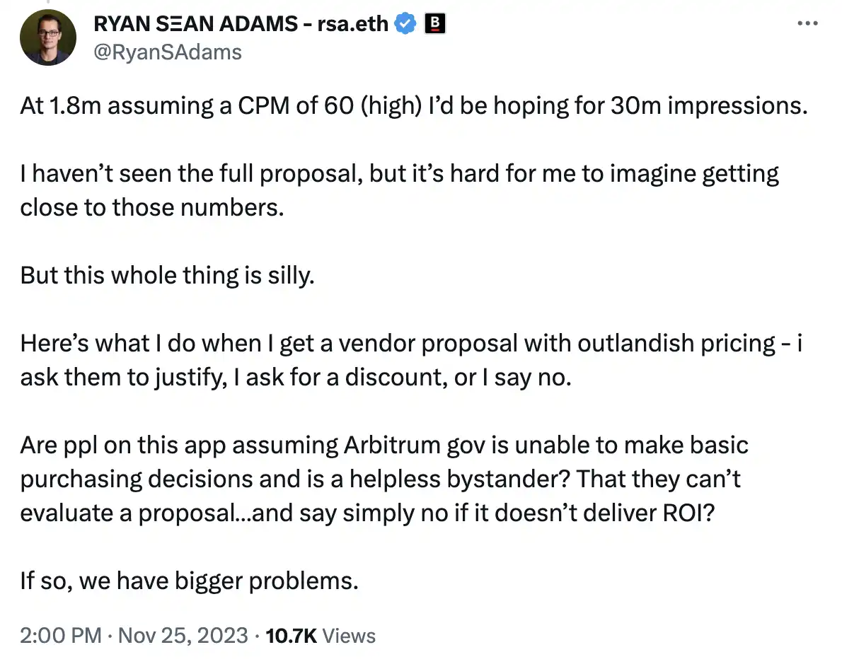 Ryan 也是因为感受到了「人们对 banklessDAO 发送给 Arbitrum 的营销提案感到不安,进而联想到 Bankless」这种情绪,从而不得不公开做出澄清。他指出,自己也是「今天才知道这个 Arbitrum 提案」的。