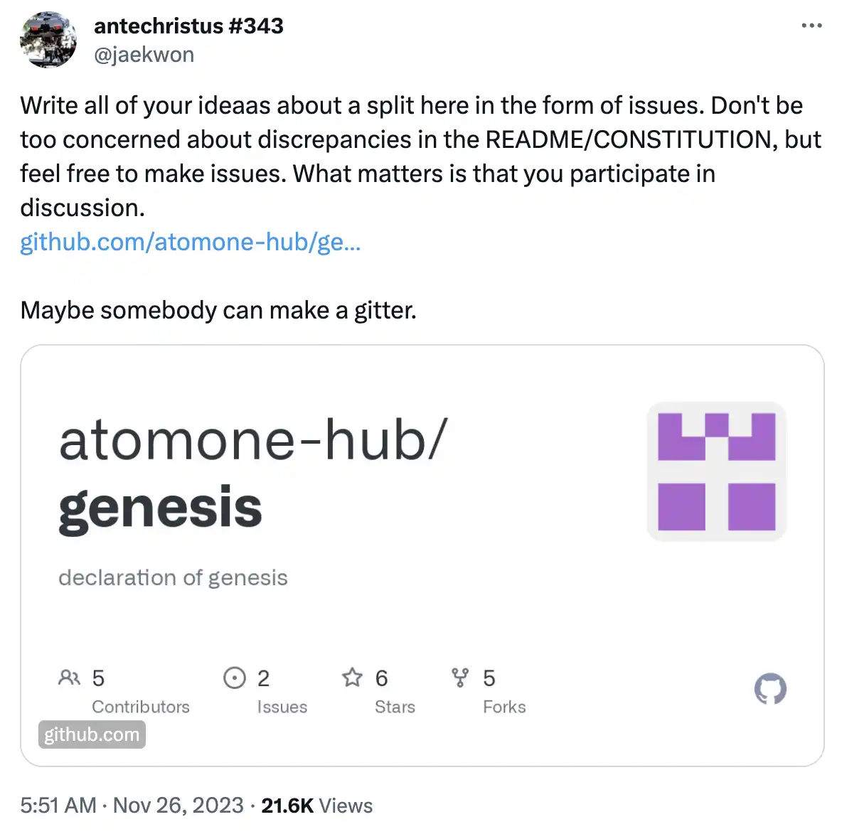 而11 月 27 日,Cosmos 联创 Jae Kwon(@jaekwon)发文表示,将对「Cosmoshub4」分叉,新网络名称为「AtomOne」。此话一出,或许更会将 Cosmos 的讨论推至高潮。