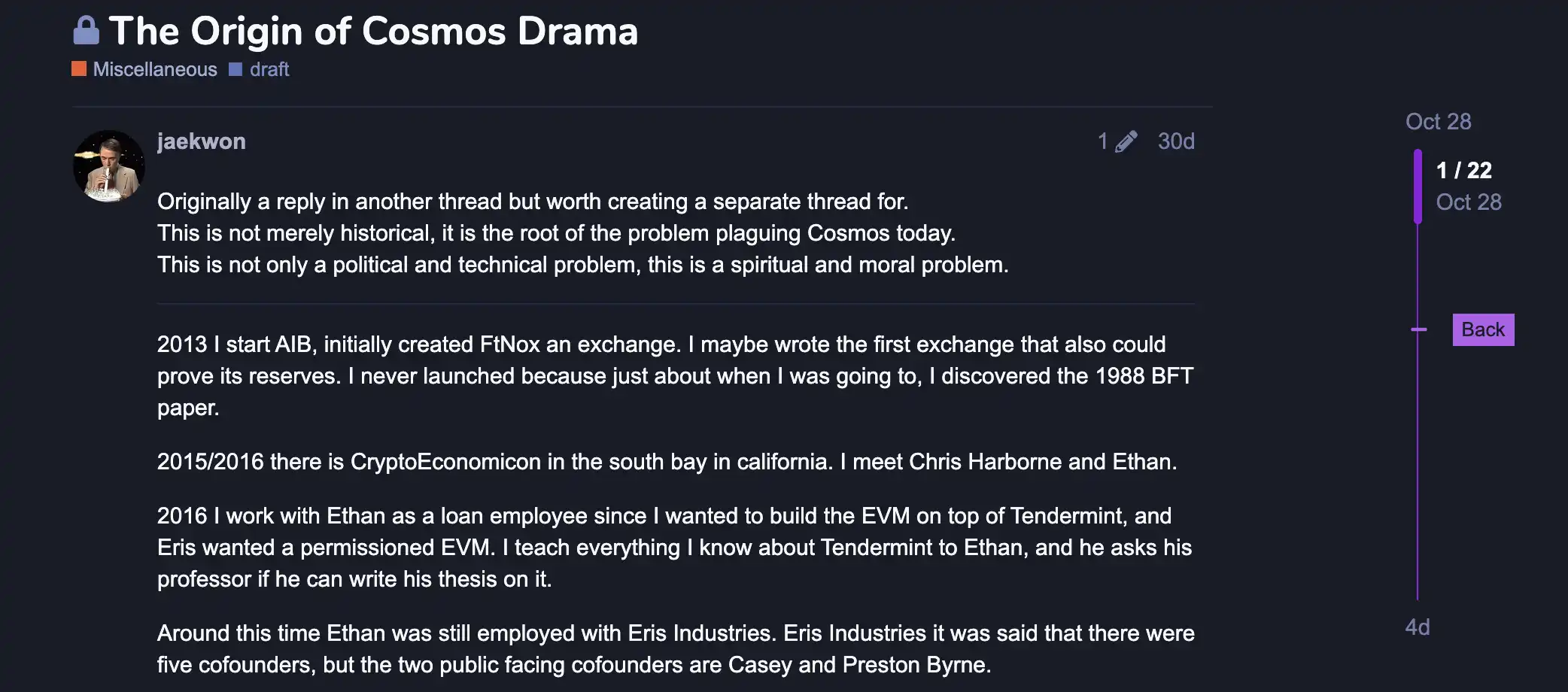 事实上,本次提案和分叉引起的风波与热议,或许早已有苗头。Jae 在 10 月底曾发表博客文章,披露了自己从 2013 年参与 Cosmos 开始,至今在项目内部遇到的一系列问题。而主要问题,便集中在另一联创 Ethan Buchman(@buchmanster)身上,Jae 认为 Ethan 策划了项目的分裂并挪用资金。