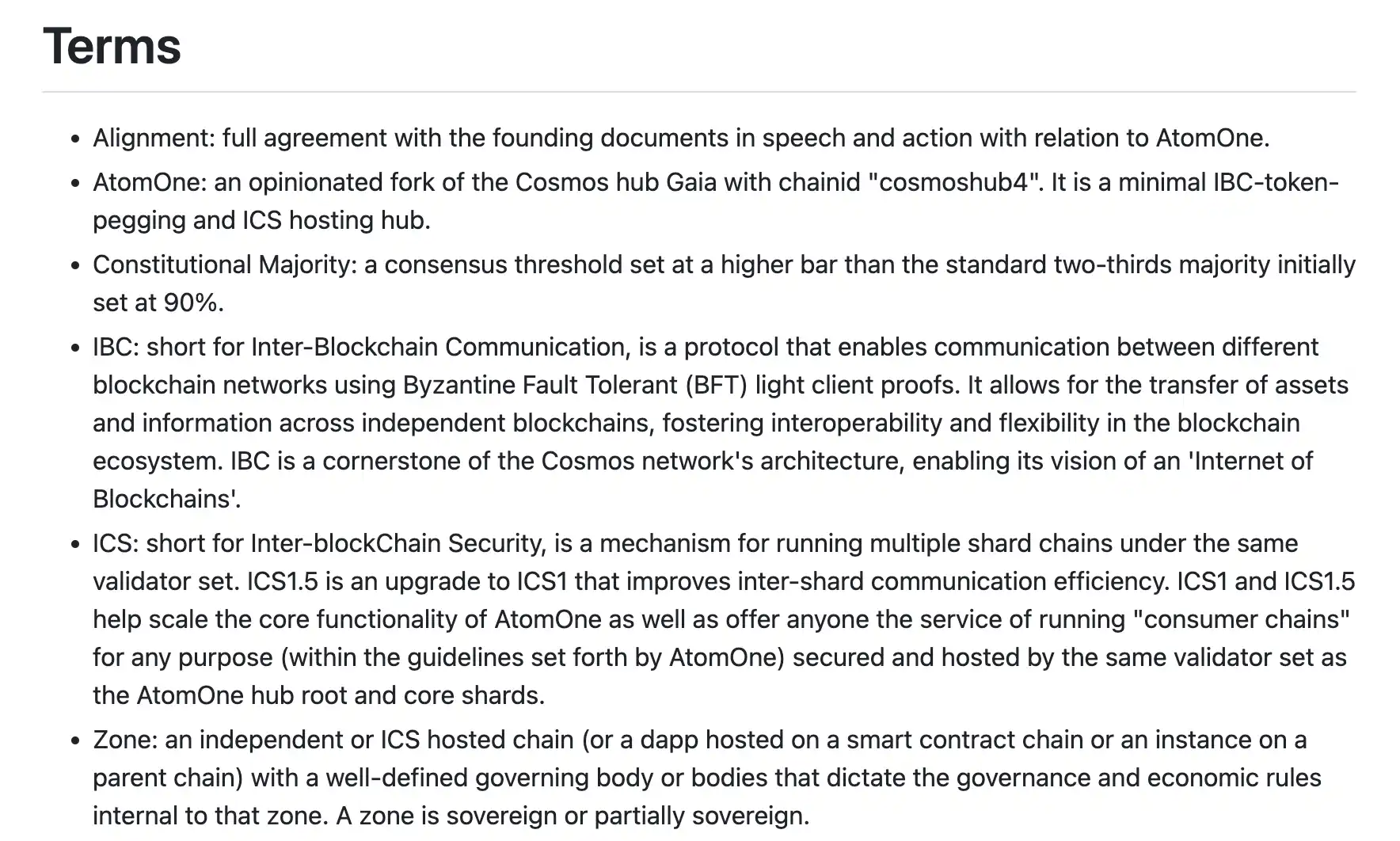 与此同时,$ATOM1 将被定义为最小 ICS1.5 IBC AtomOne Hub 的质押代币,始终保持 2/3 的 $ATOM1 质押。该文件还详细列举了包括治理措施、修复「流动性质押」、安全系统、技术指导委员会等分叉细则。
