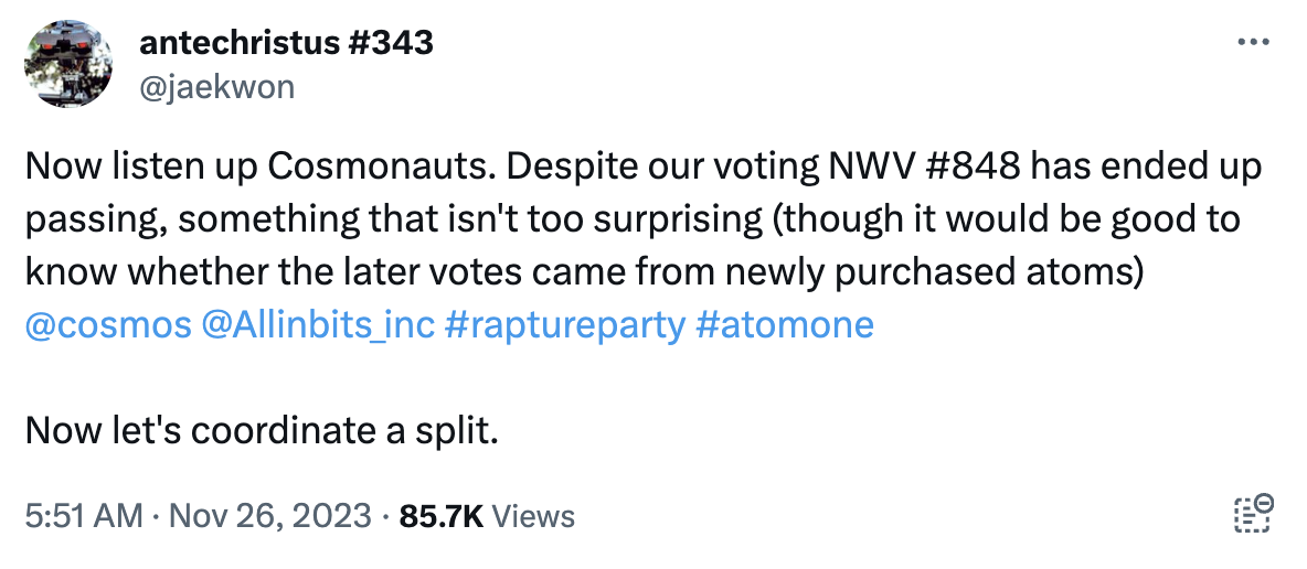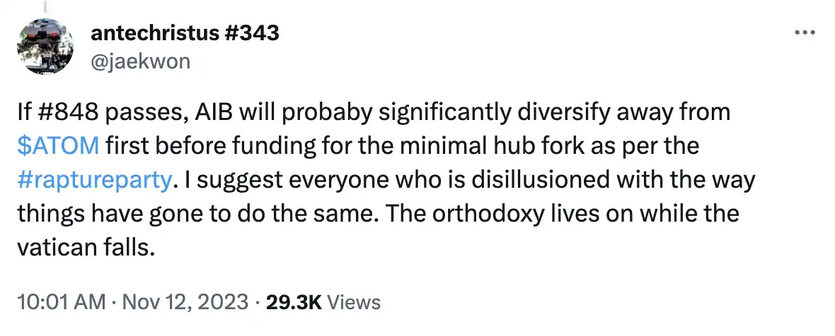 与此同时,在提案发起的当日,早已离开 Cosmos 的 Cosmos 联创 Jae Kwon(@jaekwon),便在社交平台上发表动态指出,如果 #848 通过,AIB 可能会首先从 ATOM 大幅多元化,然后再根据 #raptureparty 为最小集线器分叉提供资金:「我建议所有对现状感到失望的人也这样做。」
