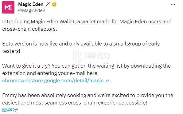 11 月 27 日,NFT 市场 Magic Eden 宣布推出插件钱包,该钱包专为 Magic Eden 用户和跨链收藏者打造。目前 Beta 版本现已上线,仅向一小部分早期测试者开放。用户可在指定链接申请加入测试。