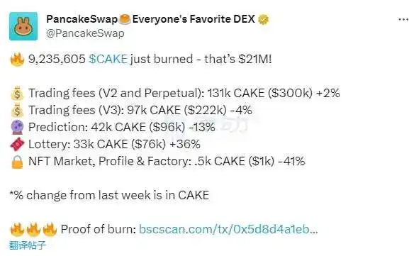 PancakeSwap:今日销毁超 923 万枚 CAKE,价值约 2100 万美元