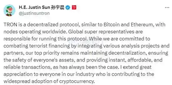 Justin Sun 回应「Tron 成为恐怖组织首选加密网络」言论:Tron 致力于打击恐怖主义融资