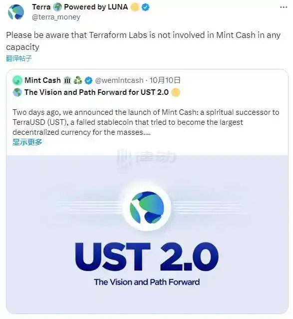 11 月 27 日,Terraform Labs 在其社交平台发表声明称其不会以任何身份参与 Mint Cash 项目。