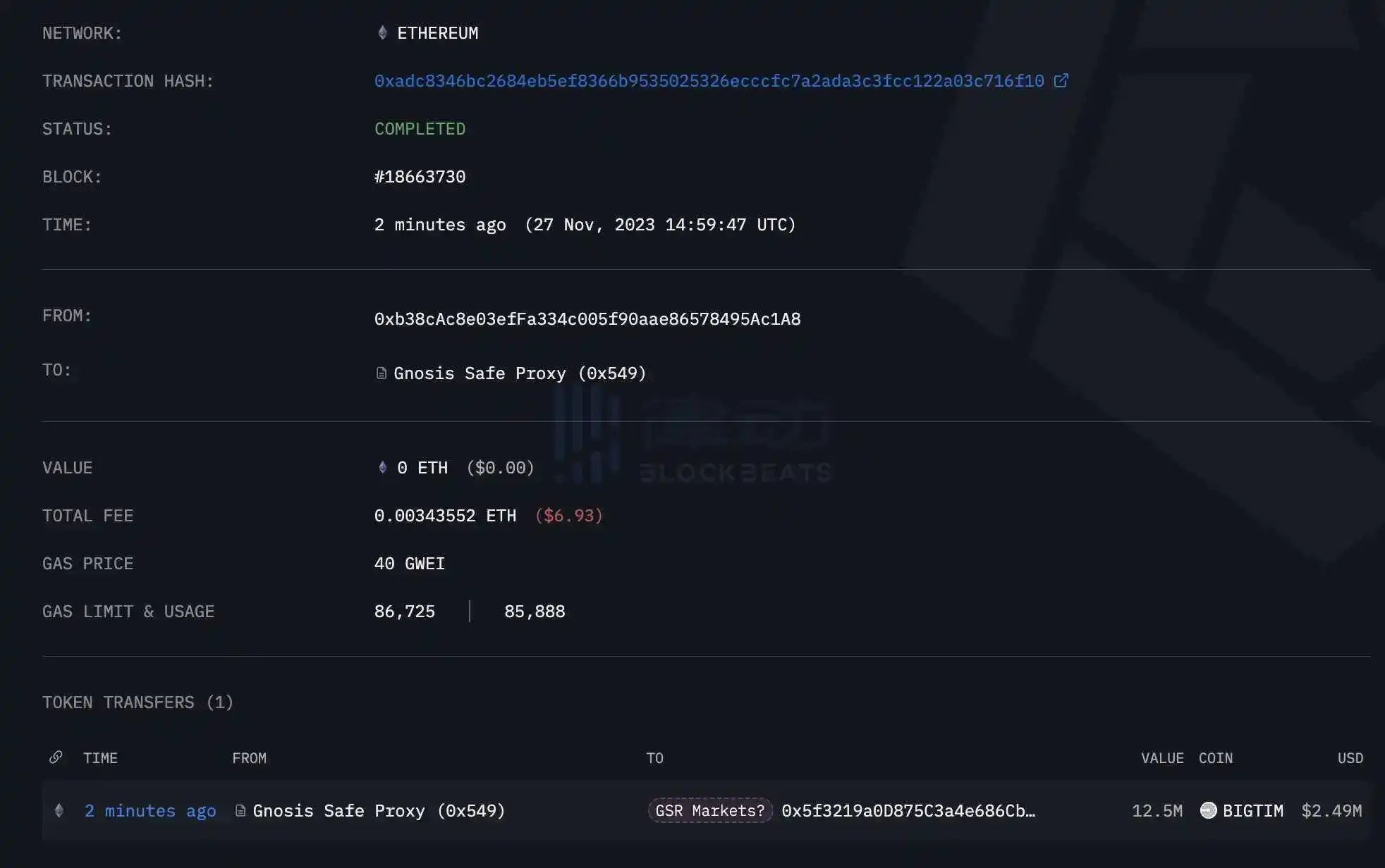 Bigtime 项目方再次向 GSR Market 转账 1250 万枚 BIGTIME