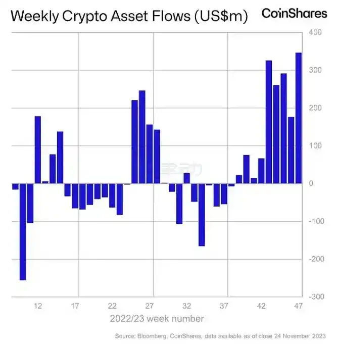 11 月 27 日,据 CoinShares 周报数据,上周数字资产投资产品的资金净流入 3.46 亿美元,已连续 9 周净流入,且本周创近 9 周最大单周流入金额。报告指出,目前市场处于 2021 年底牛市以来规模最大的一轮上涨,其刺激因素是市场预期将在美国推出基于现货的 ETF。价格上涨和资金流入的结合现已将管理资产总额 (AuM) 推高至 453 亿美元,为 1 年半以来的最高水平。