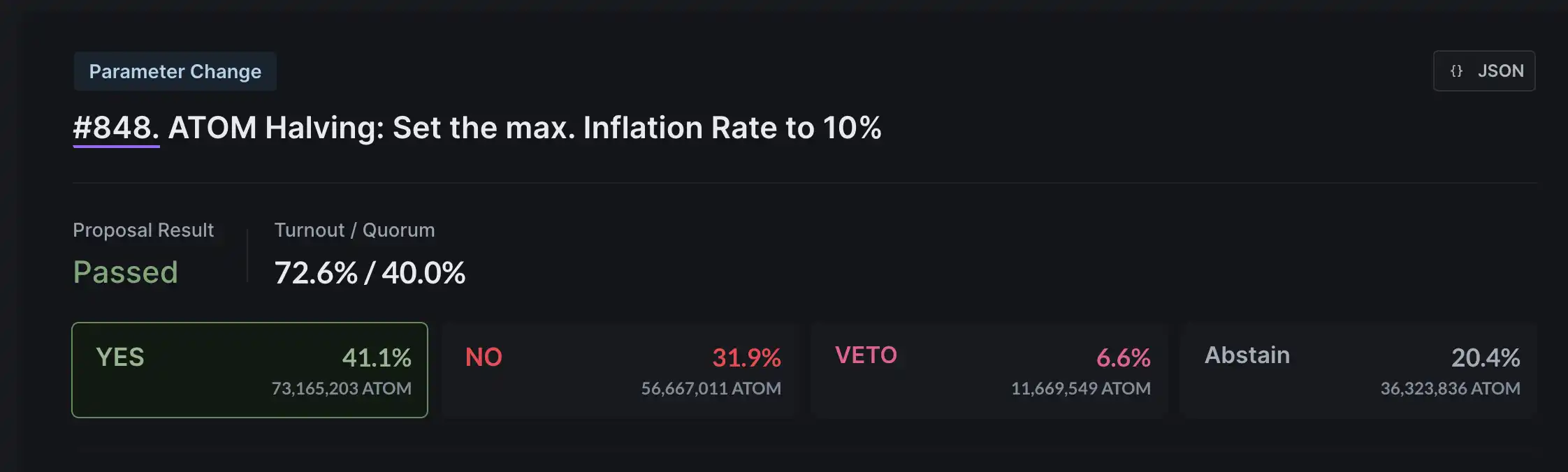 尽管 Jae 强烈反对该提案,提案仍然在 11 月 26 日顺利通过。值得注意的是,该提案支持率为 41.1%,反对率为 31.9%,弃权率却达到 20.4%。据 Cosmos Hub(@cosmoshub)官方信息显示:「本次提案的投票率是 Cosmos Hub 历史上最高的投票率——72.7%。」