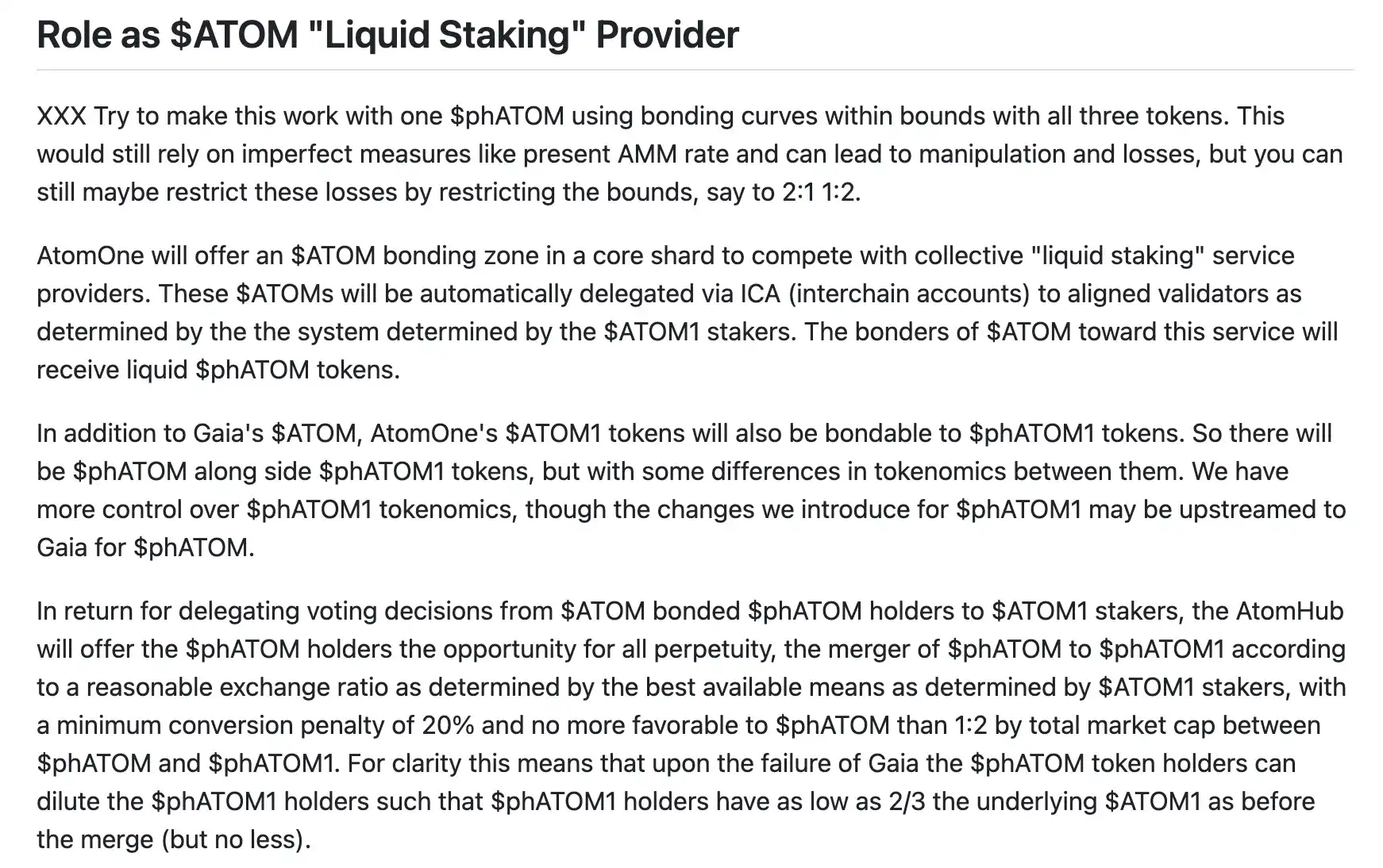 「作为将 $ATOM 债券 $phATOM 持有者的投票决定委托给 $ATOM1 质押者的回报,AtomHub 将为 $phATOM 持有者提供永久的机会,根据由 $ATOM 确定的合理兑换比率将 $phATOM 合并到 $phATOM1。最佳可用方式由 $ATOM1 质押者确定,最低转换罚金为 20%,并且 $phATOM 与 $phATOM1 之间的总市值之比不超过 1:2。为清楚起见,这意味着在 Gaia 失败时,$phATOM 代币持有者可以稀释 $phATOM1 持有者,使得 $phATOM1 持有者的基础 $ATOM1 低至合并前的 2/3(但不少于)。」