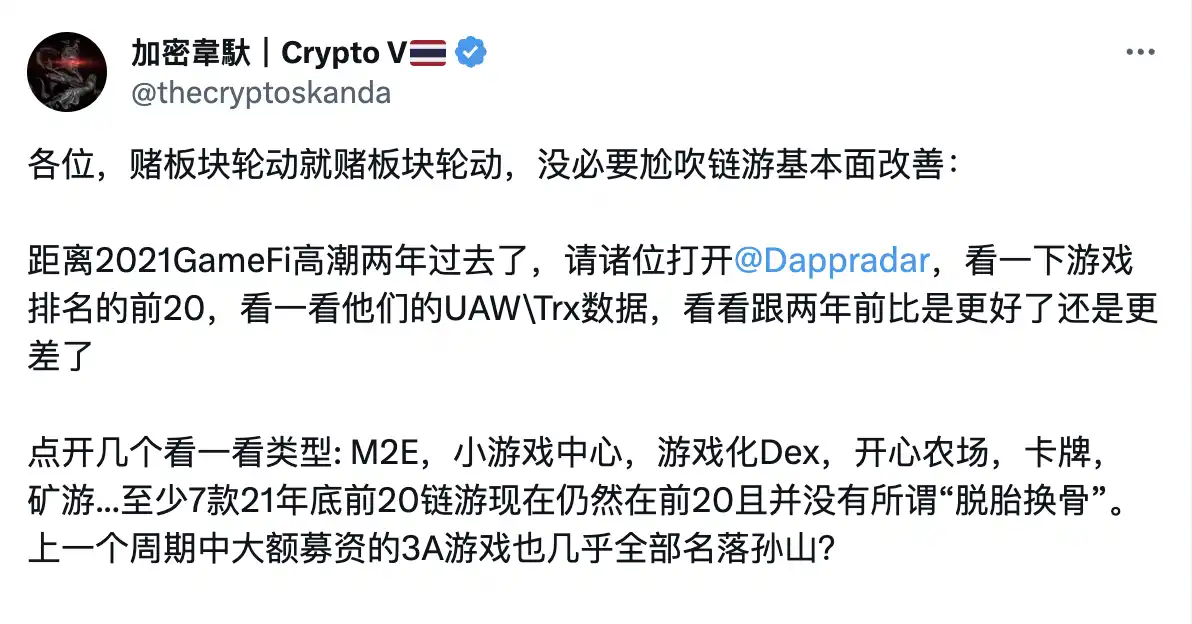 但如独立研究员陈剑 Jason 所言「很遗憾暂时还没有看到有如加密猫、Axie、StepN 这样范式创新出现。」而加密分析员@thecryptoskanda也并不认为链游的基本面得到了改善,他认为如今排名靠前的链游仍旧是两年前、一年前就已经获得过成功的项目。「炒作 GameFi」,似乎也成了每一波加密行情都不可缺少的预留节目。