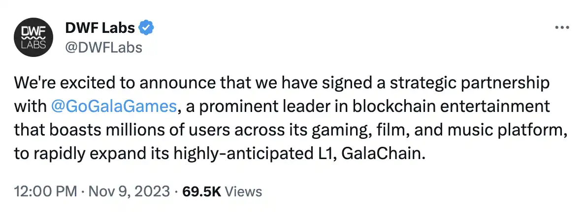11 月 9 日,DWF Labs 宣布与以太坊生态链游平台 Gala Games 签署战略合作伙伴关系,以加速其 L1 GalaChain 的采用。