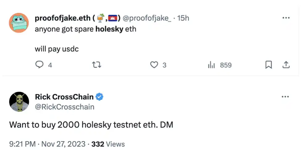 据社区反馈,Sky Strife 的测试代币一个只需 0.3RMB,但现在一张 pass 卡差不多要 3000 人民币,用户直言道「牛市测试网也没见过这样的」,社区里也出现很多人场外收 holesky 的 ETH 以进行游戏试玩。