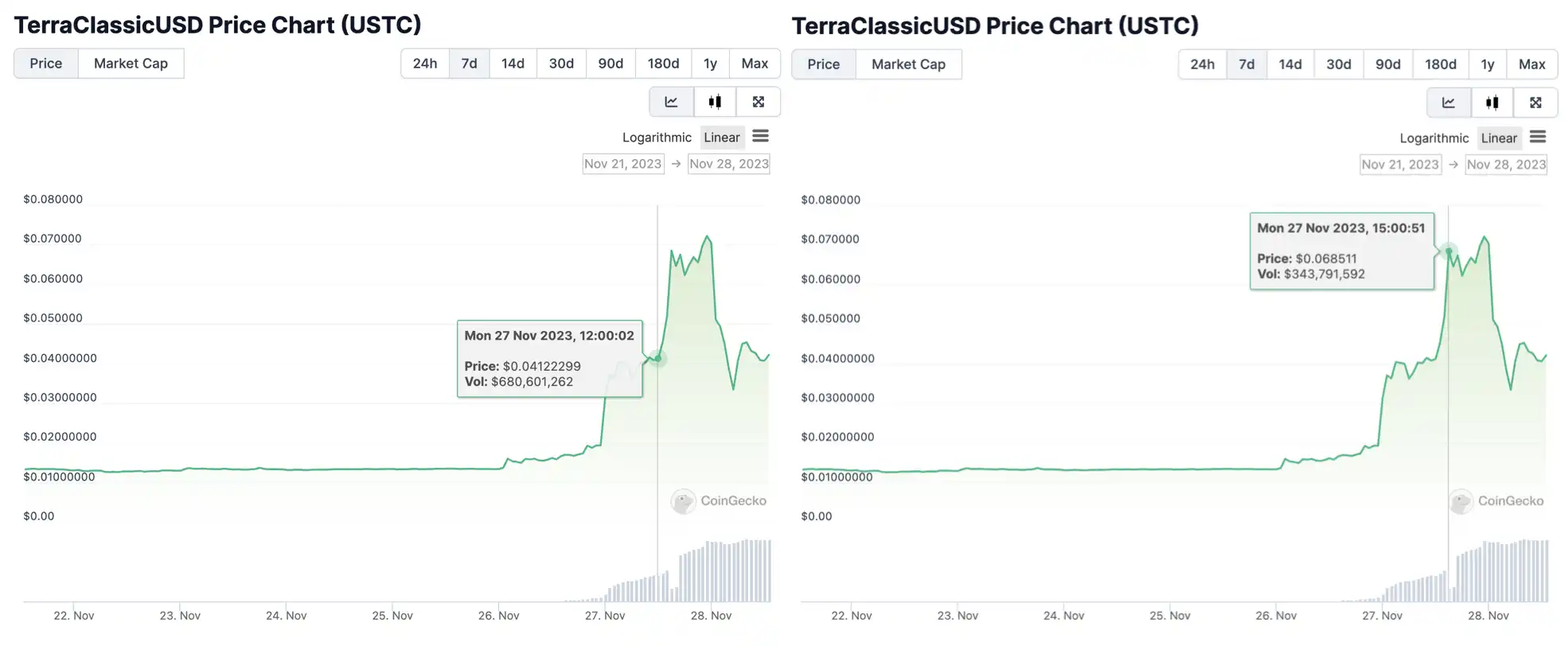 但随后,USTC 价格又开始暴跌,从 11 月 27 日 23 时许的最高点至 11 月 28 日的 5 时许一路下滑,最低探至 0.03344409 美元,较最高点跌去约 54%。