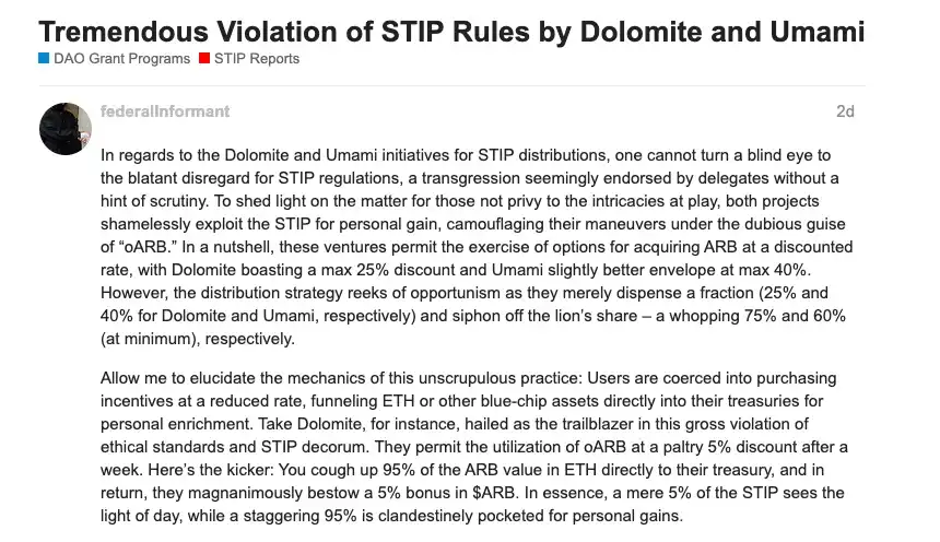 先是 Arbitrum 社区发现了生态短期激励计划(STIP)中存在一些小范围造假行为—— 两家项目 Dolomite 以及 Umami 申请资金扶持为假,中饱私囊为真。