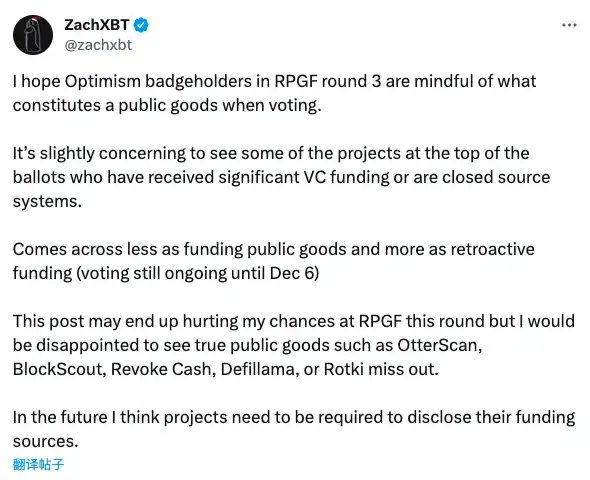 ZachXBT 表示,当前 RetroPGF 治理投票中排名靠前的许多项目并不是真正的公益性质项目,其中部分项目要不是曾拿到过 VC 的大额融资,要不就是仍未开源,这或将导致 OtterScan、BlockScout、Revoke Cash、Defillama、Rotki 等真正的公益性质项目拿不到本该获得的资助。