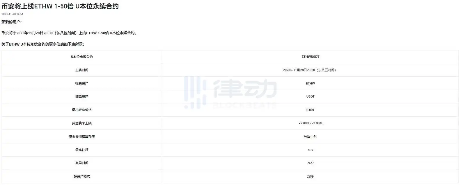 Binance 将上线 ETHW 1-50 倍 U 本位永续合约