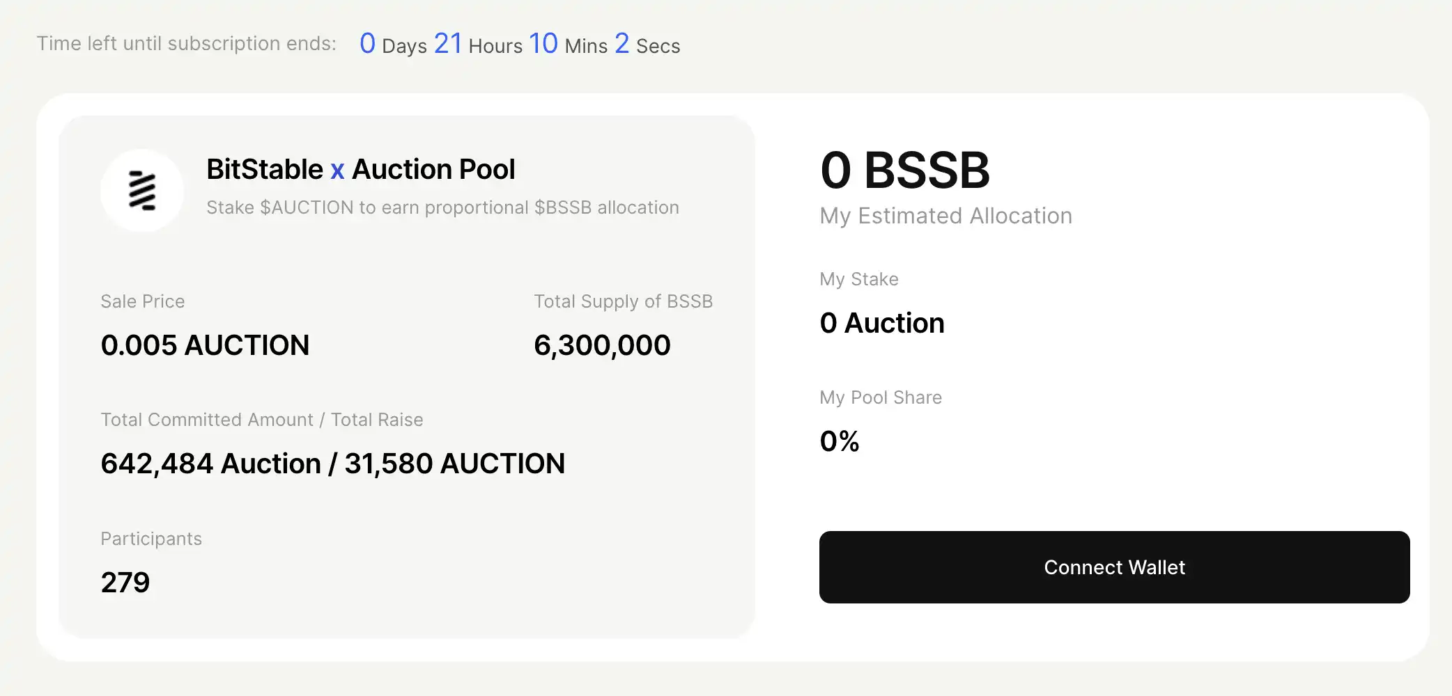 据 观察,截止到发稿时,BitStable 在 Bounce Finance 上吸引了 279 名参与者,$BSSB 的总供应量为 6,300,000 枚,而用户质押的$AUCTION 为 642,484 枚。