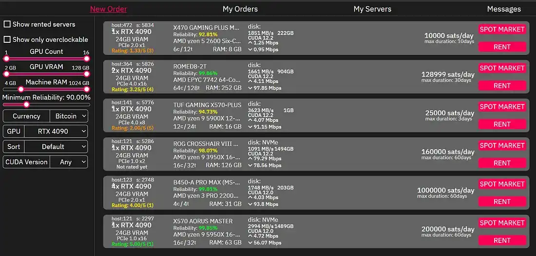 该市场的主力芯片是 RTX30、RTX40 系列。这是英伟达 2018 年上市的带有光追功能的新一代高性能显卡,在整个英伟达芯片体系中处于中高端系列。主要运用在游戏、创作、渲染等活动中,RTX40 系列被称作「游戏玩家和创作者终极平台」。如果要进行大规模的人工智能培训,更多的采用的是最新的 H100 和 A100 芯片。因此,按照 Clore.AI 目前的算力配置来看,电影渲染、挖矿可能是更容易执行的,人工智能训练、大规模计算则比大型算力中心要弱一些。