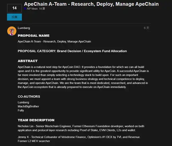 原文中提到了一个名为"ApeChain"的提案,其目标是在 ApeCoin DAO 生态系统中推动研究、部署和管理 ApeChain(原文见扩展链接【3】)。文中表述了团队与多个技术解决方案合作伙伴会面并讨论了每个技术解决方案的优势和弱点,以寻求每个合作伙伴的支持。经过项目方团队的深思熟虑选择了支持 Layer2 Rollups,以此更好的吸引开发者在 ApeChain 上进行构建。