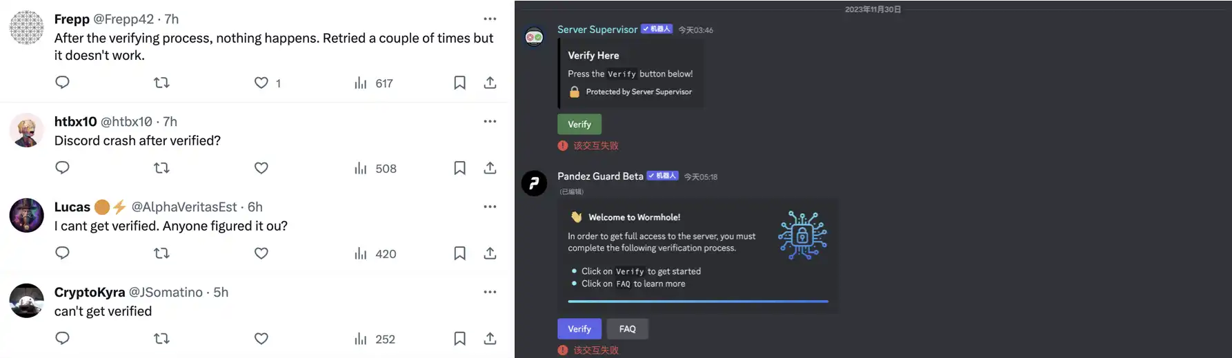 社区也出现了教你如何与 Wormhole 交互的空投教程贴,第一步就是要先进入 Wormhole 的 Discord。但 记者发现,截至撰稿前,该 Discord 已经有超过 11 万成员。而由于涌入人数过多,新用户从昨晚已无法加入该频道,纷纷卡在了验证界面。 记者尝试加入该频道时也无法通过该频道的验证界面。