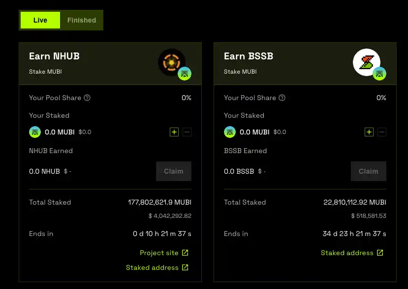 11 月 26 日,MultiBit 上线了质押系统。用户可以质押$MUBI 代币,在 Mutibit 平台上以 ERC20 或 BRC20 代币的形式获得奖励,目前,用户可质押获得的代币为 NHUB 和 BSSB,截止撰稿时,已有超 2 亿枚 MUBI 在 Mutibit 上质押。