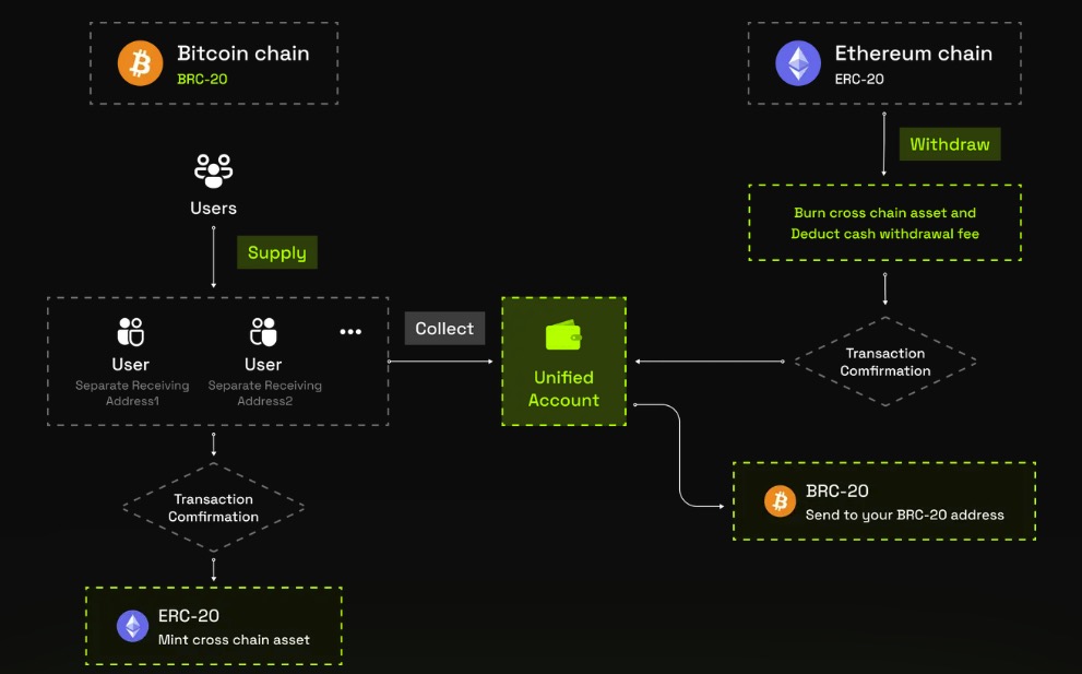 MultiBit 简化了比特币的 BRC20 和 EVM 网络之间的代币转移过程。首先,用户将 BRC20 代币转移到专用的 BRC20 地址。确认后,Multibit 协议开始运作,在以太坊或 BNB 链上铸造出等量的代币。Multibit Protocol 会从所有分发的唯一地址中收集代币。这些代币会被安全地转移到一个统一的冷钱包中。当用户需要提取代币时,Multibit Protocol 将从 EVM 链中销毁相应数量的代币。然后将等值代币从安全的冷钱包转移给用户。