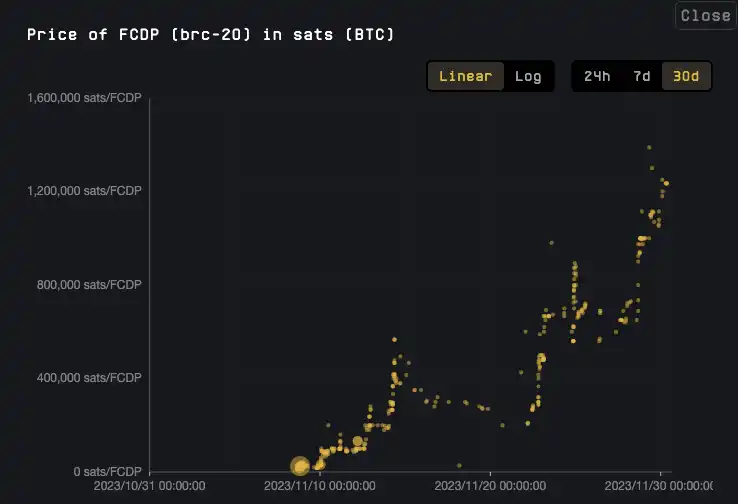 在 DeFi 中,通过 CDP 可以实现借贷、杠杆做空、套利等多种金融操作,因此,FairLight CDP 有望为 BTC-20 带来更多的交易量和流动性。其代币 FCDP 也受到社区的热捧,据 UniSat 数据显示,自 FCDP 推出不到 1 个月以来,其价格已翻了超 3 倍。截止撰稿时,其地板价为 0.01BTC,总交易额已超 22 BTC。
