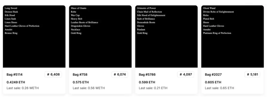 Loot 于 2021 年 8 月 28 日由 @Dom Hofmann 发布,不同于常见的 PFP 类型的 NFT,例如 BAYC 和 Crypto Punks,Loot 的每个 NFT 都是白字黑底的文字,对于这些文字的解释权是非常自由开放的,其完全由社区共创自治生长的特性,吸引了大量生态贡献者和相关衍生项目。