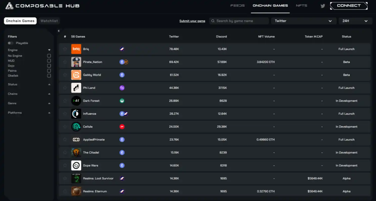 最后也介绍一下目前仍在萌芽阶段的全链游戏的聚合器/发行平台。目前由于全链游戏仍处于非常早期的阶段,市面上可玩的全链游戏数量极少,根据 Composable Hub 的数据显示,包括 alpha、beta 和完全上线的游戏中,可玩的数量不超过 30 个。