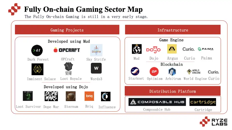 目前在全链游戏引擎方面包括了 Mud、Dojo、Argus、Curio、Paima 等,其中 Mud 和 Dojo 目前是最主流的两个全链游戏引擎,构建出了 EVM 兼容生态和 Starknet 生态双雄争霸的局面,在这里也主要介绍下这两个游戏引擎