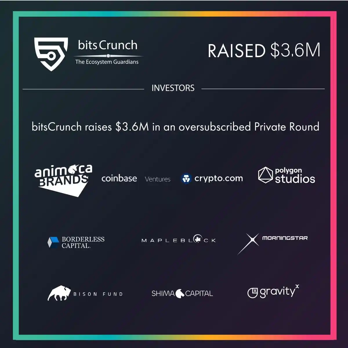 2022 年 2 月,bitsCrunch 宣布完成 360 万美元私募融资,Animoca Brands 领投,参投方包括 Coinbase Ventures、Crypto.com Capital、Polygon Studios、Borderless Capital、Mapleblock、Morningstar Ventures、Bison Funds、Shima Capital、GravityX 等。