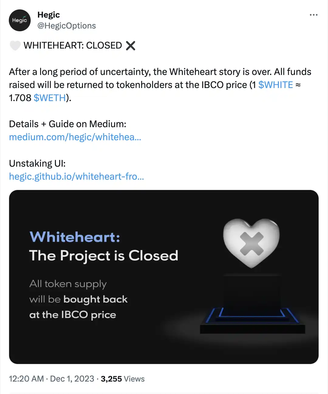 12 月 1 日,Hegic 官方发布声明,表示「经过长时间的不确定之后,Whiteheart 的故事结束了」,Hegic 在博文中称 Whiteheart 协议概念非常棒,但过去几年的重点是开发 Hegic,它已经从基本对冲合约的理念演变而来。因此,他们决定永久关闭 Whiteheart。而此前所有筹集的资金将以 IBCO 价格(1 $WHITE ≈ 1.708 $WETH)返还给代币持有者。