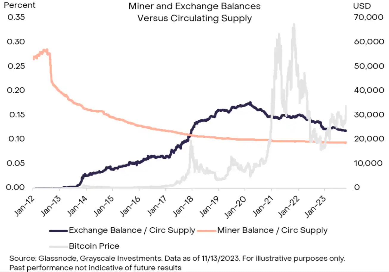 注:通常,交易平台持有多个钱包/地址,这就是为什么 Binance 在这里出现多次。来源:Bitinfocharts、Grayscale Investments。截至 2023 年 11 月 14 日的数据和持仓以美元计。本图表中比特币价格为 36,891 美元。