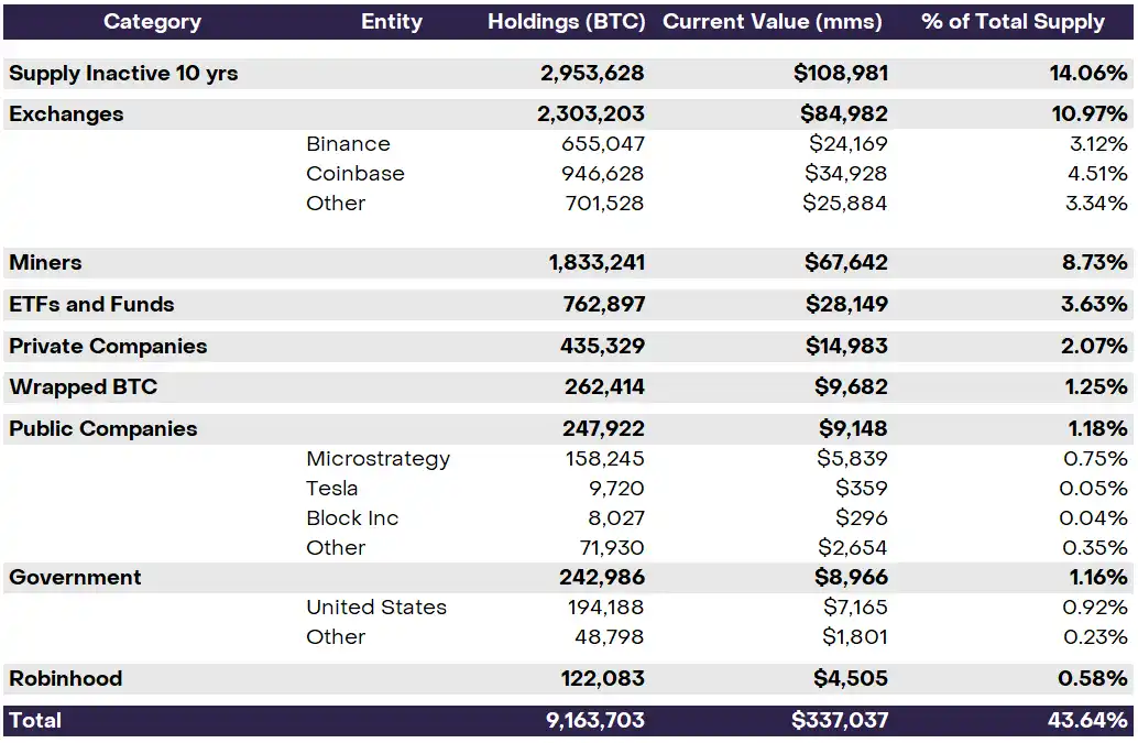 比特币的持有者涵盖了从交易平台到上市公司再到主要政府的各种机构。尽管这些群体的一些成员可能与其他群体重叠(例如,不活跃的供应和矿工或上市公司和矿工),但大约 40% 的比特币总供应可以归因于可识别的所有权群体,如交易平台、政府实体、上市和私人公司(例如,特斯拉和 Block Inc.)、维护比特币网络的矿业公司、ETF 和其他上市基金、Wrapped BTC、消费者交易平台(例如 Robinhood)以及不活跃的地址。下图展示了每个群体。