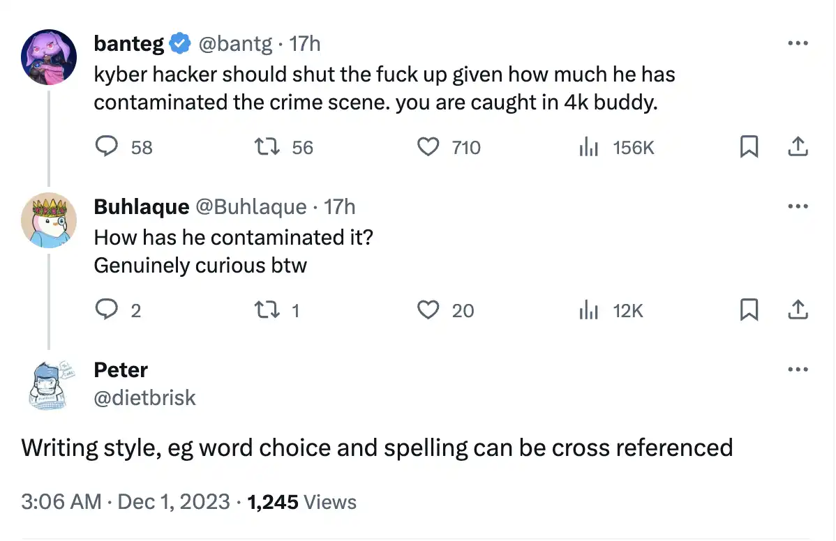 现在,全世界除了想知道中本聪是谁之外,更想知道攻击 Kyber 并留下这段文字的黑客是谁。许多人认为黑客留下如此长的一段文字,将很容易被识别出身份,比如留言的写作风格,单词选择和拼写可以交叉引用。