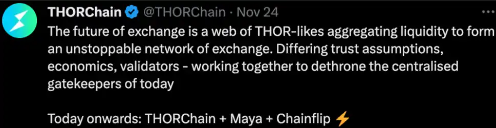 综上所述,目前 Chainflip 的使用体验、去中心化程度和安全性会略好于 Thorchain,但 Thorchain 本身的先发优势,市场知名度和市场占有率也是其重要的竞争优势。因此,**我们预测 Chainflip 很难在短期内完全替代 Thorchain。**更可能如 Thorchain 官推所言,Chainflip 会和 Thorchain 一起不断侵蚀跨链桥的市场份额。