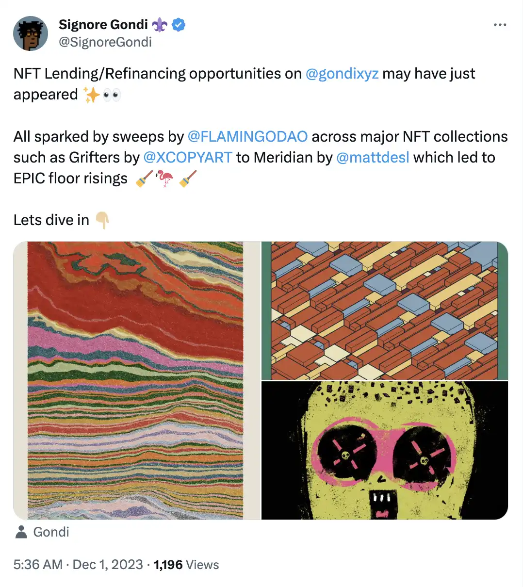 「NFT 借贷、再融资机会可能刚刚出现」,社区用户@SignoreGondi 认为这是由 Flamingo DAO 对主要 NFT 系列的扫购引发的。