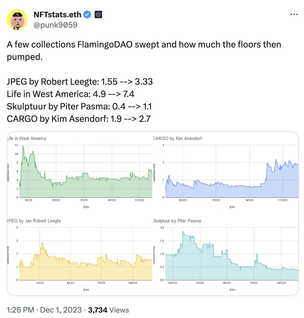 而 Flamingo DAO 的扫货行为也让多个 NFT 的地板价有所上涨。据 NFTstats.eth 统计,JPEG 地板价从 1.55 ETH 涨至 3.33 枚 ETH,Life in West America 地板价从 4.9 ETH 涨至 7.4 ETH,Skulptuur 地板价从 0.4 ETH 涨至 1.1 ETH,CARGO 地板价从 1.9 ETH 涨至 2.7 ETH。
