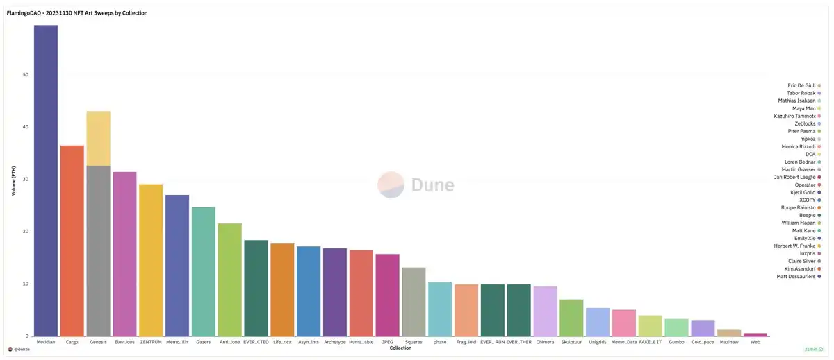 12 月 1 日,专注于投资 NFT 的 DAO 组织 Flamingo DAO 在一个多小时内购买了 26 件 NFT,包括 Matt Kane、DCA、Zeblocks 和 Emily Xie 等,总价值为 448 枚 ETH,约合 93.94 万美元。
