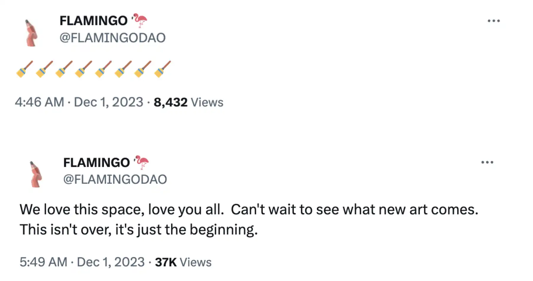 随后,其账号发布推文称「我们爱这个空间,爱你们所有人。迫不及待地想看看新艺术的出现。这还没有结束,这只是开始。」