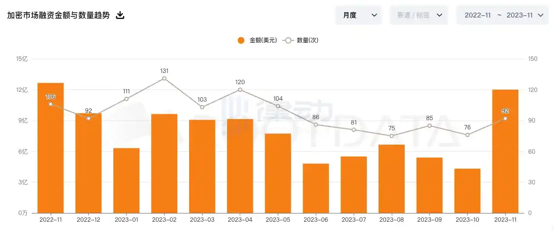 数据:11 月加密市场融资额为 12 亿美元,环比增长 178.4%
