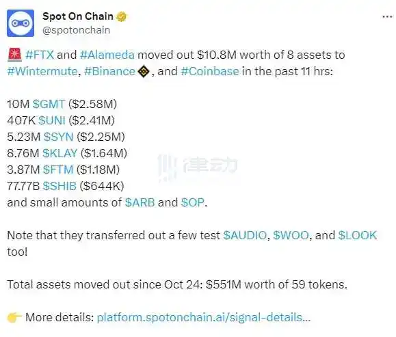 12 月 1 日,据 Spot On Chain 监测,过去 11 小时,FTX 和 Alameda Research 将价值 1080 万美元的 8 种资产转至 Wintermute、Binance 和 Coinbase,包括 1000 万枚 GMT(约 258 万美元)、40.7 万枚 UNI(约合 241 万美元)、523 万美元 SYN(约 225 万美元)、876 万枚 KLAY(164 万美元)、387 万美元 FTM(118 万美元)、777.7 亿枚 SHIB(64.4 万美元)以及少量 ARB 和 OP。
