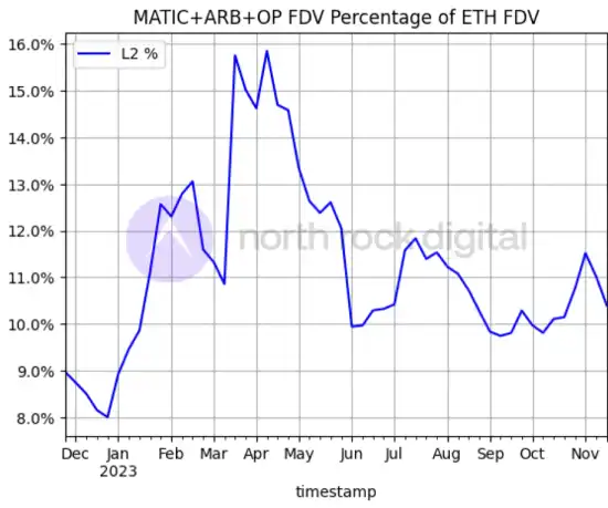 STX 与 BTC 以及与其他第一层/第二层(L1/L2)生态系统的相对估值现在也达到令人侧目的水平。预计到明年四月份,Stacks 很可能最终完成了中本聪升级,使其能够提供首个完全运行的以 BTC 计价的生态系统。与此同时我们将接近 BTC 减半,而 Stacks 生态系统将处于其营销活动的中期。这应该为 STX 提供一个有利的环境,以缩小其相对于这些其他资产的估值折扣。STX 目前的交易价格为 BTC 的全稀释市值(FDV)的 0.15%,而以太坊 L2 的交易价格总和为 ETH 的 FDV 的 10%。虽然折扣是合理的,但目前折扣的大小显示了 STX 的无限潜在上升空间,因为它通过中本聪升级大幅提高了其能力,并随着时间的推移逐渐成为真正的 BTC 第二层(L2)。