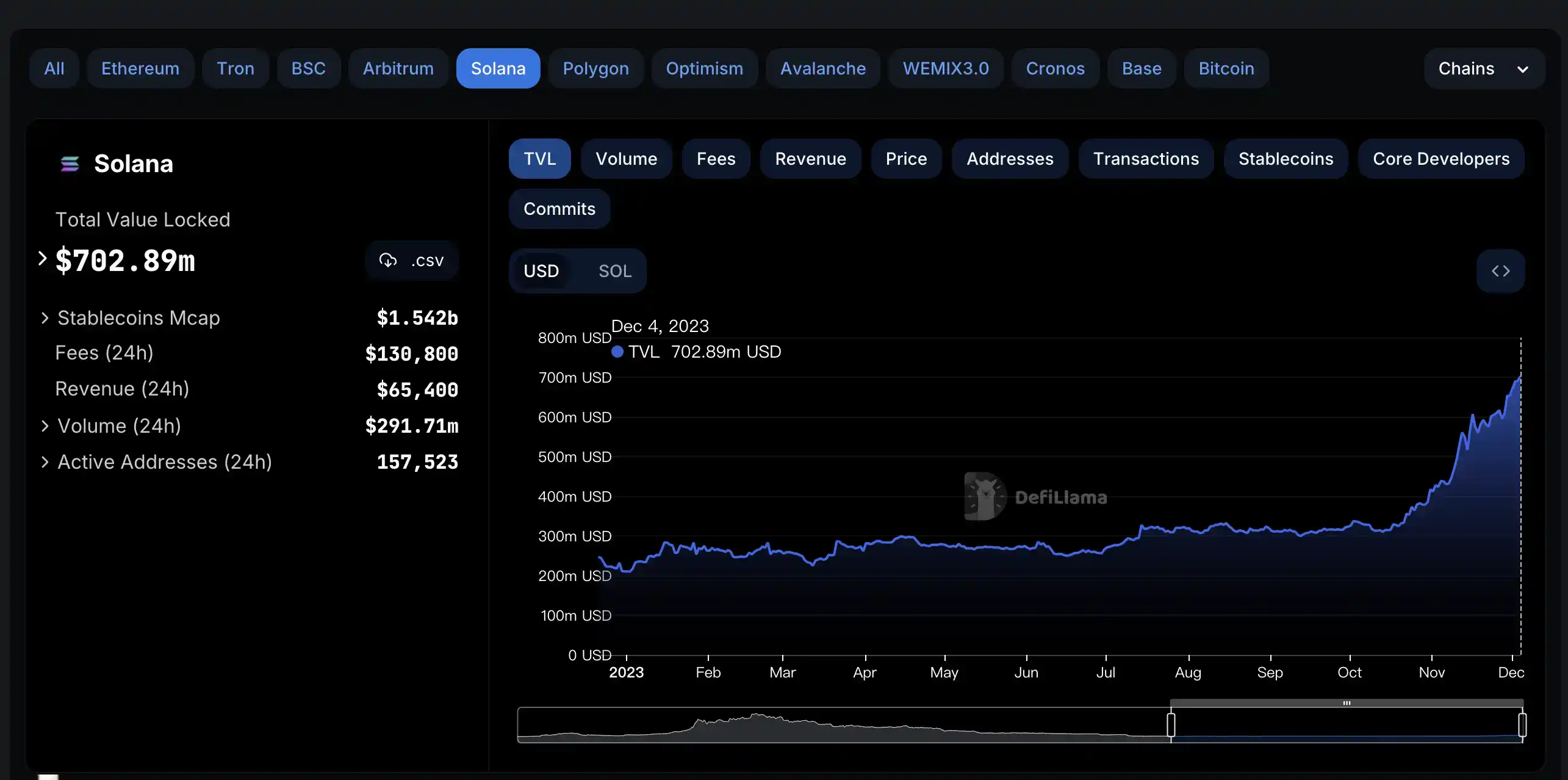 据 DefiLlama 数据显示,Solana 总锁仓量(TVL)回升突破 7 亿美元,再创 2023 年以来新高。